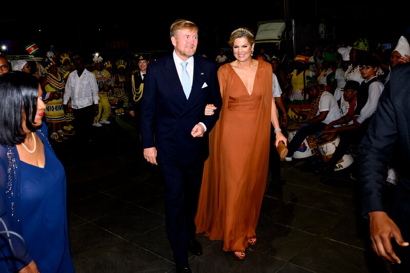 Máxima straalt in nieuwe japon bij rommelig staatsbanket in partycentrum in Paramaribo